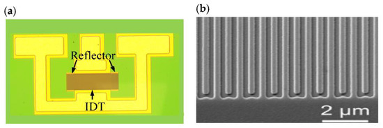 Figure 3 shows the optical and scanning electron microscopy (SEM) images of the fabricated one-port SAW resonator. As shown in Figure 3b, the fabricated IDT pattern is well. All the fabricated resonators configured with IDTs consisting of 100 pairs of fingers and 40 grating reflectors placed on both sides of the IDTs, and aperture length of 40 IDT period p (p = λ, where λ is the SAW wavelength). The measured Y11 of SAW resonators is characterized by an Aglient E5071C vector network analyzer (Keysight Technologies, Roseville, CA, USA) with a vector network analyzer and ground–signal–ground (GSG) probes.