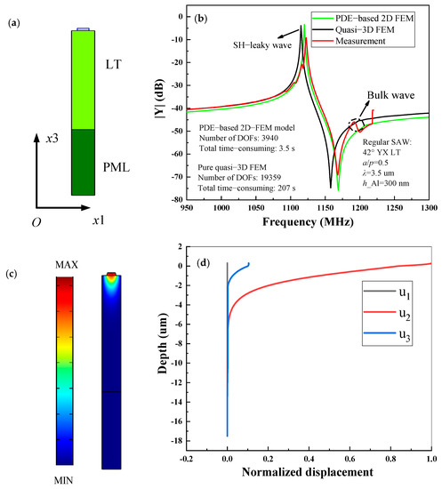 Figure 4a shows the single-finger 2D-FEM model of regular SAW resonator on Al/42° YX cut LT structure. In this case, the IDT period p = 3.5 µm, the thickness of Al electrode h = 300 nm, and the thickness of LN is 3p. In the following calculation, the thickness of the bottom substrates is always set as 3p, and the thickness of the PML is set as 2p. The input admittance Y11 curves of SAW resonators are presented for comparison in Figure 4b. As can be seen clearly, the simulated result based on the PDE-based 2D-FEM model using COMSOL code fits better with the experiment than that of pure quasi-3D FEM. This is mainly because the propagation loss, dielectric loss, electrode resistance loss and electrode shape are fully considered into the proposed model in our work by modifying PDEs themselves. As can be seen, the measured curve exists the bulk wave at ~1.2 GHz due to the wave reflection among the finger of practical SAW resonator with finite-length, which does not affect the coupling coefficient and quality factor Q of the main SAW mode we were concerned with. In addition, the simulation speed of the PDE-based 2D-FEM method is about 0.01 s for each frequency point and its total time cost is 3.5 s in the frequency range from 950 MHz to 1300 MHz, while the pure quasi-3D FEM model requires about 0.59 s for each frequency point and its total time cost is 207 s due to the amounts of DOFs. It is noted that the above calculations are under the same frequency interval of 1 MHz. Thus, the periodic analysis is still a powerful simulation tool for researchers to analyze the performance of the SAW mode we were concerned with, and important SAW properties including the phase velocity, coupling coefficient, and relative bandwidth, etc., can be obtainable from the calculated Y11.