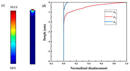 Figure 6c,d show the calculated mode shape and the displacement field distributions entirely composed of three partial components at the resonance frequency in the TC-SAW resonator, respectively. The displacements along x direction (u1) are close to zero while the horizontal (u2) and vertical shear components (u3) are dominant. It is interesting that the horizontal shear components (u2) and vertical shear components (u3) are relatively large. The reason is mainly that the structure of the TC-SAW device is configured with an embedded electrode, the displacement and stress boundary conditions on piezoelectric interface change with not only electrode but also SiO2, which results in more intense coupling of the partial acoustic surface waves (u1, u2, u3). In addition, although most acoustic energy is concentrated near the surface, some still partly radiates into the substrate. Therefore, for the TC-SAW resonator, a very important question is how to eliminate spurious waves.