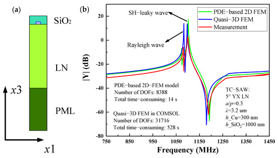 Temperature-compensated (TC) SAW resonators are more preferable for practical application because of their good temperature stability. In this case, the typical TC-SAW resonator fabricated on SiO2/IDT/5° YX-LN structure is investigated. Figure 6a shows the single-finger 2D-FEM model of TC-SAW resonator used for simulation. The IDT period p = 4 µm, the thickness of Al electrode h = 380 nm, and the thickness SiO2 is 600 nm. Figure 6b shows the simulated and measured Y11 of the TC-SAW resonator for comparison. One can clearly see that the simulated result agrees well with measurement based on the PDE-based 2D-FEM model using COMSOL code. It is noted that the spurious wave of Rayleigh wave at ~1100 MHz is also characterized. Compared to pure quasi-3D FEM, the characteristics of the spurious wave are more accurate due to more practical factors taken into account. In addition, the total time cost of the proposed method is 14 s in the frequency range from 750 MHz to 1450 MHz, but the pure quasi-3D FEM model requires a total time cost of 528 s due to the amounts of DOFs.