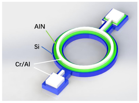where E is the Young’s modulus, A is the cross-section area, m is the total mass of both Si and AlN, and R is the radius of ring. The effect of aluminum is neglected in Equation (11). For the contour mode, the TCF expression can be simplified as [47]