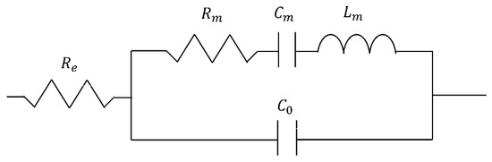 The BVD (Butterworth Van Dyke) model is a simple physical model for acoustic resonator modeling that was applied in this study to characterize the one-port lamb wave resonator [38]. The model of a lumped-element equivalent circuit is shown in Figure 2. C0 is the static parallel capacitance, Rm is the motional resistance, Cm is the motional capacitance, Lm is the motional inductance, and Re is the series resistance of electrode. C0, Rm, Cm, Lm, and fs are defined as [39].
