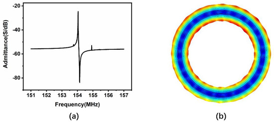 Finite element method (FEM) simulation was performed on the AlN ring type resonator. The Young’s modulus of silicon was 170 GPa, the density of silicon was 2329 , and all parameters in simulation were the same as the parameters in the theoretical equations above. AC voltage was applied on top of the aluminum layer, and the bottom silicon layer was grounded. The admittance versus frequency result is illustrated in Figure 3a, and the series resonant frequency was 154 MHz, which is similar to the theoretical result. Figure 3b displays the vibration mode. For the piezoelectric coefficient d31 of AlN, the electric field in direction 3 (vertical) caused strain in direction 1 (horizontal), which showed the expanding/contracting vibration across the width direction of the ring.