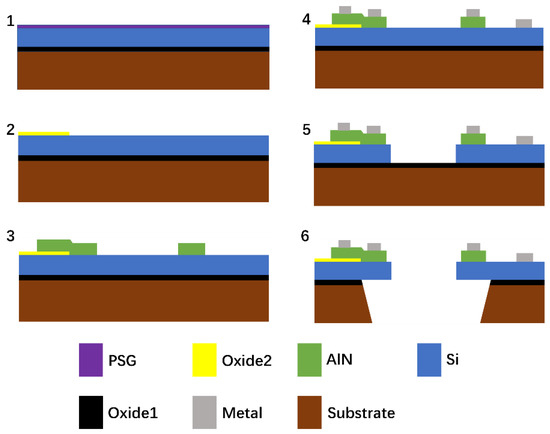 A contour mode resonator was successfully fabricated. The device fabrication process is shown in Figure 4, and the detail parameters are shown in Table 1. The fabrication process started with a SOI wafer. The first step was to deposit a phosphosilicate glass layer (PSG), and annealing was performed to drive the phosphorous dopant into the top silicon layer, which resulted in a n-type heavily doped silicon layer. The PSG layer was removed by 49% hydrofluoric (HF) solution. The second step was depositing a 200 nm of oxide, which isolated the pad metal to the ground; the oxide layer was patterned by photoresist, and etched by reactive ion etching (RIE). In the third step, a thin film of aluminum nitride with a thickness of 0.5 m was deposited by reactive sputtering, patterned by photoresist and etched by wet etching (85% phosphoric acid). In the fourth step, the pad metal was deposited by electron beam evaporation through the liftoff process, containing 20 nm chromium and 1000 nm aluminum. Then, in the fifth step, deep reactive ion etching (DRIE) was applied to etch the silicon down to the oxide layer. Finally, the sixth step was the backside etching in order to release the resonator. RIE was used to remove the bottom oxide, and DRIE was applied to etch the substrate layer. The oxide layer underneath the silicon layer was etched using a buffered HF solution.