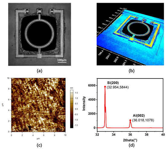 An optical holographic microscope was applied to obtain the 2D and 3D images of the resonator, as shown in Figure 5a,b. Figure 5a shows that the geometric dimension was similar to that of the design model; the diameter of the ring was 312.3 , and the ring width of silicon, AlN, and aluminum was 29.54, 13.37, and 7.46 . The discrepancy between the measured AlN width and the designed AlN width was believed to be the result of the nonideal microfabrication process of wet etching. The backside of the SOI wafer was etched with sufficient area for the vibration of the resonator using DRIE technology. From the 3D image in Figure 5b, the measured thickness of silicon, AlN, and Al was shown to be 10.0 , 0.48 , and 1.06 , which means that the dimensions of the fabricated device is consistent with the design model.