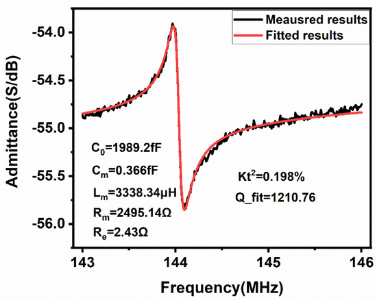 We used a ZNB vector network analyzer (ZNB8, Rohde & Schwarz GmbH, Munich, Germany) and a MPI manual probe station (TS200,MPI Corporation, Suzhou, China) to measure the S parameter (return loss) versus frequency parameter, and the result was converted to admittance versus frequency () shown in Figure 6. The black line is the simulation curve and the red line is the curve fitted by MATLAB (MATLAB R2019a, MathWorks, Natick, MA, USA). The series resonant frequency was determined from the measured frequency at minimum S parameter. The uncertainty of measurement was 0.01 dB in S parameter magnitude, and the accuracy of the measured frequency achieved a 10 kHz resolution. By comparing the experimental result with the simulation result, the resonant frequency was reduced by 6.5% from 154 MHz to 144.03 MHz, which is believed to be due to the mass loading of the top aluminum electrode. The quality factor Qfit calculated in MATLAB is expressed as
