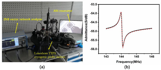 (a) ZNB Vector network analyzer and Lakeshore TTPX cryogenic probe station, (b) results of the measured admittance versus frequency of the resonator in atmospheric pressure (black line) and low pressure (red dotted line).