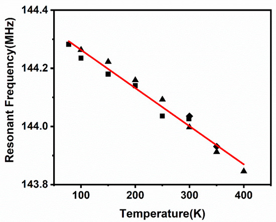 Cryogenic cooling was applied from room temperature to 77 K. Afterwards, the temperature was increased from 77 K to 400 K, and then cooled down to 300 K in order to characterize the temperature characteristics and the temperature hysteresis effect on the AlN resonator. The experimental results are shown in Figure 8 and Figure 9, respectively. The experimental results from room temperature (300 K) to 77 K are denoted by the square data points, the results from 77 K to 400 K are denoted by the triangle data points, and the results of the temperature drop from 400 K to 300 K are denoted by the diamond data points. The resonant frequency increased by 0.18% from 144.03 MHz at the temperature of 300 K to 144.28 MHz at the temperature of 77 K, fitting the negative temperature coefficient of the theoretical TCF. The results with the fitted line reveal that the resonant frequency varied linearly with temperature. The linear equation to fit the result is expressed as