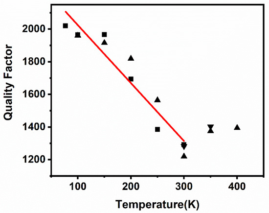 The measured result of the quality factor versus temperature characteristics is displayed in Figure 9. Based on the measurement result, we estimated that fT was close to fM, around 300 K. As a result, the quality factor decreased with the increase in temperature when the temperature was lower than 300 K, while the quality factor increased with the increase of temperature when the temperature was higher than 300 K. Based on Figure 9, a linear relationship between quality factor and temperature was found when the temperature is below 300 K. The quality factor versus temperature characteristics from 77 K to 300 K can be linearly fitted by Equation (16)