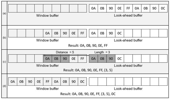 Process for LZ77. (a) String data to be decompressed; (b) Shifting data to Window buffer; (c) String data compression with distance and length; (d) Shifting duplicated string data.