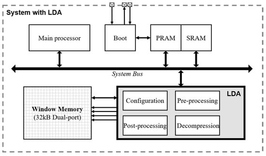 Figure 3 shows the block diagram for the embedded system with the LDA. We utilize a Cortex-M0 processor as a main processor and the program data are stored in the phase-change random access memory (PRAM) through the boot module. The LDA is controlled by the instruction of the main processor via the system bus. The PRAM and static-random-access-memory modules (SRAM) of the SoC are single port memory. The window memory has 8-bit data width and 32 k depth with a dual port. The LDA directly reads and writes data to the window memory in accordance with the instructions of the main processor.