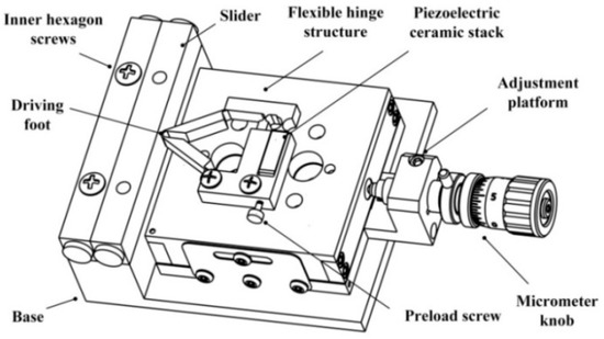 The piezoelectric driving platform is composed of a piezoelectric ceramic stack, a cross-roller linear guide, a adjustment platform, a flexure hinge structure, and a pedestal. Figure 1 illustrates the structure of each part. The cross-roller linear guide is fixed on the adjustment platform with screws. The piezoelectric stack is closely connected with the flexure hinge structure, and the preload is adjusted by fastening screws. Use the micrometer knob to modify the position of the cross-roller linear guide to change the pre-tightening force between them.