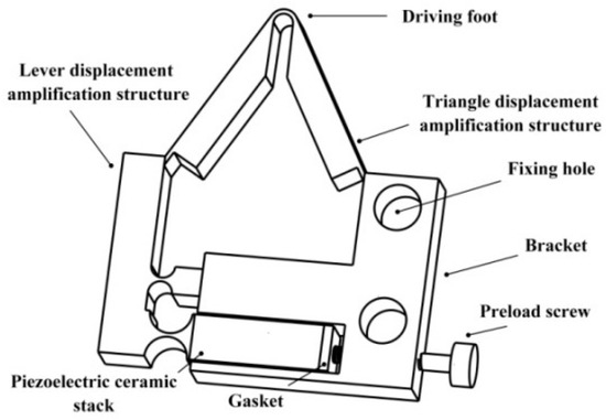 Figure 2 shows the prototype of the proposed actuator. It consists of a bracket, a two-stage flexible hinge structure, a piezoelectric ceramic, a gasket, and a pre-tightening screw. The gasket is added between the pre-tightening screw and the piezoelectric ceramic. Prevent the pre-tightening screw directly acting on the piezoelectric ceramic stack. Two fixing holes on the bracket fix the piezoelectric driving component to the platform.