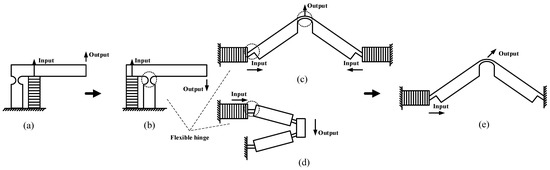 Schematic diagram of micro displacement amplification structure: (a) Lever displacement amplification structure; (b) Changed lever displacement amplification structure; (c) Triangle displacement amplification structure; (d) Four-bar displacement amplification structure; (e) Changed triangle displacement amplification structure.