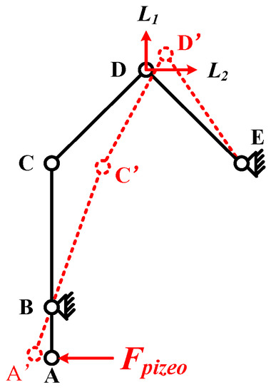 The diagrammatic sketch in Figure 4 shows the deformation of piezoelectric ceramic stack acts on point A in the process of stretching. Point C moves to point C′ by lever amplification. The generated pressure deforms the triangular flexible hinge structure, so that the driving point D moves to D′. The displacement L1 of the driving point D provides the preload for the slider, and the displacement L2 causes the slider to move laterally.