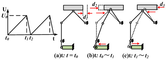 Figure 5a shows the initial moment is t0. The adjusting platform provides the required preload on the contact surface of the linear guide. From t0 to t1, the piezoelectric stack is in a state of gradual tension. The flexible hinge structure is deformed due to the push of the piezoelectric ceramic stack. The slider moves to the right driven by friction, resulting in displacement d2, as shown in Figure 5b.