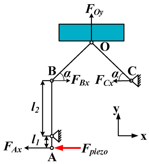 According to Formula (4), the clamping force of the contact surface is related to the inclination α. By changing α, the clamping force can be changed, thus, enhancing the driving performance. According to the main parameters of the flexible hinge structure, the magnification is 2.1, as shown in Figure 7. The definition of the coordinate axis in the figure is consistent with that in Figure 6. When the extrusion force is equal to the output force produced by piezoelectric ceramic, the α can be calculated as 48.39° according to Formula (5). Therefore, when α ≥ 48.39°, FOy ≥ Fpizeo.
