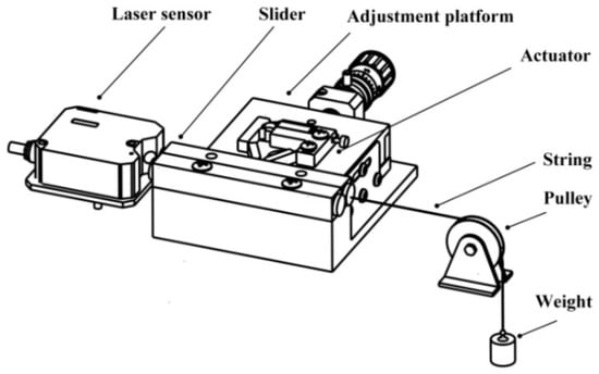 According to the above analysis results, a 5 mm × 5 mm × 16 mm piezoelectric ceramic stack (NAC2013-H16, COREMORROW, Harbin, China) is added to the optimized flexure hinge structure. The hinge structure is welded by Al7075 and 65Mn. The maximum stroke of the cross-roller linear guide (VR4-80H×7Z, THK, Japan) is 58 mm. The assembled actuator and cross-roller linear guide are fixed on the corresponding platform by screws, and the pre-pressure between them is adjusted to 80 N. A string is fixed on the right side of the slider, and it is connected with a suspended weight through a fixed pulley. The pulley-string-weight is used as the load of the slider. The laser sensor (LK-H008, KEYENCE, Osaka, Japan) with a measuring range of ±0.5 mm detects it on the left side of the slider, which is used to detect and record the output performance of the slider, such as displacement or velocity. Figure 10 shows the mechanical load measurement system. In the experimental platform, the ramp voltage applied to the actuator is generated by the signal generator (UTG930, UNI-T, Dongguan, China), and the amplitude of the voltage is amplified by the high voltage amplifier (HA-820, PINTECH, Guangzhou, China). The oscilloscope is used to observe the stability of voltage waveform and adjust the voltage peak to peak with the high voltage amplifier. The magnetic base is used to adjust and fix the position of the laser sensor, and the data detected by the laser sensor will eventually be stored in the PC, as shown in Figure 11.