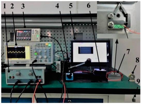 Experimental platform of the proposed stick-slip piezoelectric actuator (1. High Voltage Amplifier, 2. Oscilloscope, 3. Signal Generator, 4. Magnetic Base, 5. PC 6. Laser Sensor, 7. Prototype, 8. Pulley, 9. Weight).