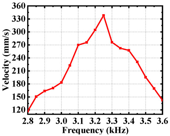 Firstly, the relationship between driving performance and excitation frequency is analyzed. Using ANSYS 15.0 (Ansys, Canonsburg, PA, USA) obtains the optimal resonance frequencies of 3.25 kHz in Modal analysis. Then, for the sake of facilitating comparison, the best excitation amplitude of 150 V is used. Finally, the parameter analysis of the frequency range is carried out to verify whether the frequency is the optimal excitation frequency, as shown in Figure 12. The slider speed increases with the rise of excitation frequency reaches the peak value at 3.25 kHz and then decreases rapidly. The result shows that 3.25 kHz is the best excitation frequency in this range.