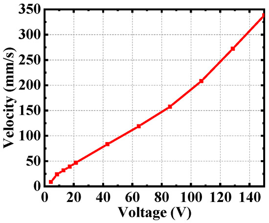 Through the above analysis, choose 3.25 kHz as the excitation frequency. The relationship between driving performance and excitation amplitude is studied, as shown in Figure 13. When the excitation amplitude is lower than 5 V, the slider cannot be driven effectively. When the excitation amplitude is greater than 5 V, the slider speed increases linearly as the excitation amplitude grows approximately. The optimum velocity is reached at the maximum excitation amplitude of 150 V.
