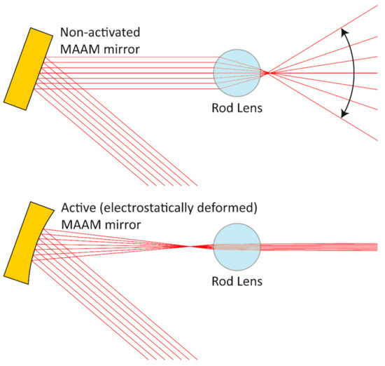 Use of the micro-electronic-mechanical system-based adaptive astigmatic membrane (MAAM) mirror in a laser line setup with a variable fan angle (schematic top view): with a non-activated flat MAAM mirror (top), the full aperture of the rod lens is illuminated and leads to a wide fan angle. Focussing (bottom) illuminates a smaller section of the rod lens, leading to a smaller fan angle.