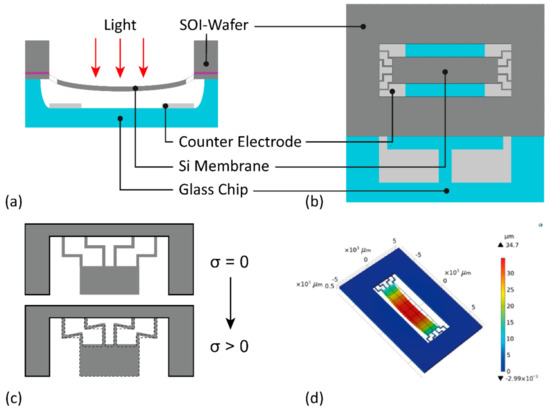 The MOEMS device was realized with two chips glued together with an adhesive (Norland Optical Adhesive 61, Norland Products Inc., Cranbury, NJ, USA). The device chip, holding the membrane and suspensions, was made from an SOI wafer (purchased from Si-Mat), and the fixed counter electrode was realized inside a cavity of defined depth on a fused silica wafer (from Siegert Wafer, Aachen, Germany).