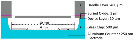 A schematic cross-section of the device is shown in Figure 4. The device layer chip was bonded upside down to the glass carrier chip with the counter electrodes and the cavity which defines the electrode distance and the free space to allow deformation of the membrane. The two counter electrode stripes were defined below the outer rims of the mirror and were electrically connected. The electrodes were defined in a distance of 5 and 3 mm from the mirror center (total length 8 mm). Therefore, the counter electrodes were defined also below the beams.