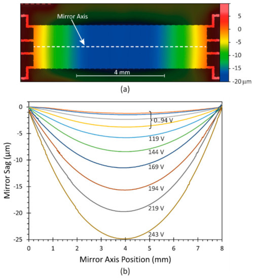 The membrane deformation as a function of the applied voltage between membrane and counter-electrode was measured with a White Light Interferometer (WLI)). As an example, in Figure 5a, the membrane deformation of the whole membrane for an applied voltage of 219 V is depicted. In Figure 5b the induced sag profile of the membrane along the long membrane axis is shown for voltage levels from 0 V to 243 V. The effective electrode distance was about 90 µm.