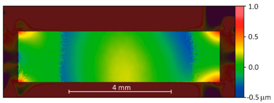 In addition, to check the optical quality of the membrane mirror, the deviation of the WLI surface measurement data from an ideal parabolic cylinder surface was calculated. As an example, Figure 6 visualizes these deviation data for the deformed membrane of Figure 5a. Considering the whole membrane area, the calculated deviation ranged from −0.3 µm to +0.7 µm. Excluding the corner areas of the membrane, the deviation range reduced to −0.2 µm to +0.3 µm. The membrane comprised polished crystalline Si, therefore the surface roughness was expected to be <1 nm.