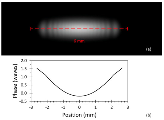 Simulated laser beam characteristics after 600 mm of free space propagation: (a) simulated irradiance, normalized to an image gray value of 200 for peak irradiance in the center; (b) simulated unwrapped phase profile along the fast beam axis.