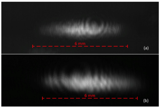 Figure 10a shows the measured beam image in the setup for the MAAM mirror at U = 0 V. The beam showed the expected elliptical shape of a nearly collimated diode laser beam but, in addition, several irradiance variations across the beam profile. These variations were more irregular, compared to the simulation of a freely propagating beam in Figure 9a. Therefore, it needed to be investigated whether these patterns had their origin in the MAAM mirror or if these patterns were the typical superimposed unintended diffraction patterns of the optical elements, dust particles, and other objects in the beam path [31,32]. For clarification, an additional image (Figure 10b) of the laser beam was taken outside the MAAM mirror setup, where the beam was propagating for just 600 mm in free space. Additionally, for the beam image in Figure 10b, taken after free space propagation, diffraction effects, similar to the ones in the MAAM mirror setup (Figure 10a), could be observed. This indicated that the patterns within the beam image observed in our MAAM mirror setup were not dominated by the MAAM mirror and originated mostly from components located before the MAAM mirror in the beam path.