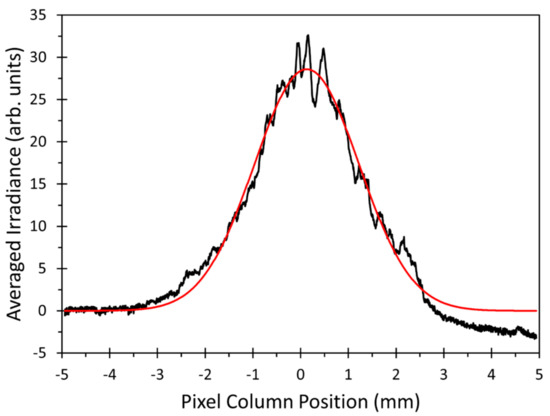 Column averaged beam profile of the laser beam in Figure 10a (black line) together with the corresponding Gaussian fit function (red line).