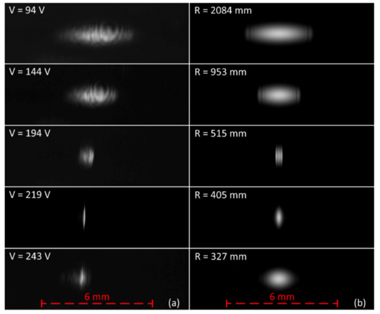 Comparison of measured (a) and simulated (b) beam profiles for varying MAAM mirror radii. For the measured beam profiles, the corresponding membrane voltages are shown in the images. For the simulated beam profiles, the mirror radii used in the simulations are shown. Note the additional simulated beam profile for the interpolated mirror radius of R = 460 mm in Figure 13, which exhibts a similar beam width like the measurement at 219 V. All images are normalized to an image gray value of 200 for the measured or simulated peak irradiance.