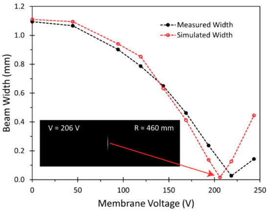 To obtain a quantitative comparison for the measured and simulated beam profile images, the resulting beam widths w were determined. As can be seen in Figure 13, the measured and simulated beam widths w satisfyingly matched over a wide range of applied voltages, derived from radii R for the corresponding optical simulations. The largest differences between measurements and simulations can be observed when the beam focus was close to the CMOS camera chip. One possible explanation for the behavior in this region is the strong sensitivity of the simulated beam width with respect to the membrane radii R. Nevertheless, the added simulation with the interpolated simulation parameters R = 460 mm and V = 206 V also confirms, by simulation, that a sharp beam width minimum can be achieved.