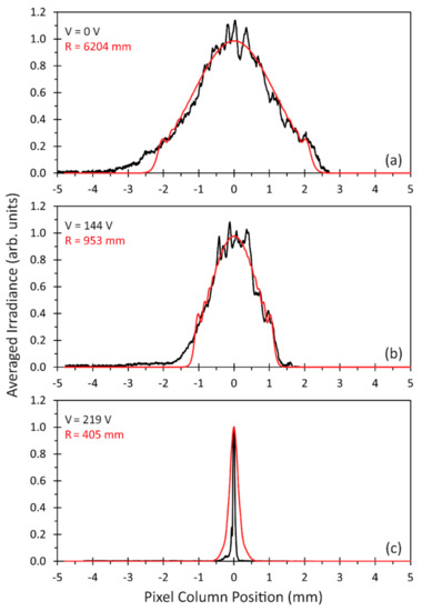 Pixel column averaged measured (black line) and simulated (red line) irradiances: (a) nearly collimated beam; (b) beam focus position behind the CMOS camera; (c) beam focus position near the camera chip.