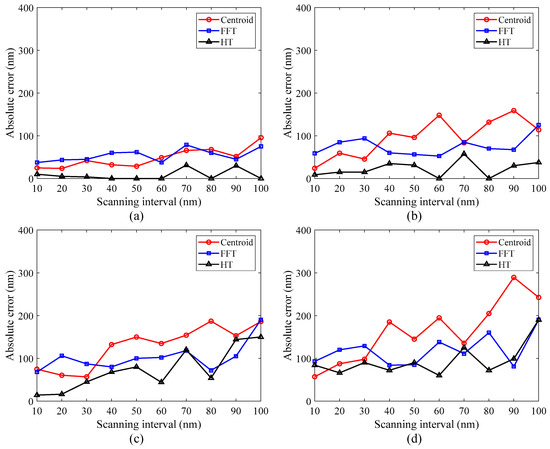 The scanning interval is an important parameter in VSI, which influences the measurement sensitivity and measurement efficiency. A smaller scanning interval means that the measurement system would collect more fringe images within the same scanning distance and hence require more calculation time. However, a larger scanning interval may not only lead to a larger positioning error of the scanner but also affect the smoothness of the reconstructed surface. The effect of the scanning interval on the measurement results was investigated under different noise levels. The relationship between the absolute errors and the scanning interval was obtained. As shown in Figure 5, with 5% random noise added, the errors vary slightly as the scanning interval increases from 10 nm to 100 nm. When 10%, 15%, and 20% random noise is added, respectively, the errors generally increase with the growing scanning interval, especially when the scanning interval exceeds 60 nm. It can also be seen that the results obtained by the centroid method are more susceptible to the scanning interval at a high noise level. In contrast, the errors introduced by the HT method have a relatively smaller increase with the scanning interval. Even if the results obtained by the FFT method fluctuate somewhat with the change in scanning interval, they show some similar trends with those of the HT method. Considering the measurement sensitivity and efficiency, the scanning interval of 30–50 nm is more appropriate in the actual measurement process. In addition to a smaller scanning interval, an appropriate interpolation technique is also important to improve the axial sensitivity that is limited by undersampling along the optical axis. It has been reported that the envelope peak curve can be corrected by using the Gaussian estimation and interpolation [30]. The interpolation technique based on second-order spline fitting can improve axial sensitivity, and post-filtering methods are also helpful to reduce measurement noise, providing a higher axial sensitivity [41].