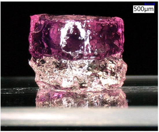 Concept of our stacked hydrogels cast on a standard microscope slide. Photo-polymerizable gelatin methacryloyl (GelMA) (transparent) on glass topped by a red-colored thermoset gelatin layer (red). The image was taken with a digital microscope (Keyence VHX-7000). The scale bar indicates 500 µm.