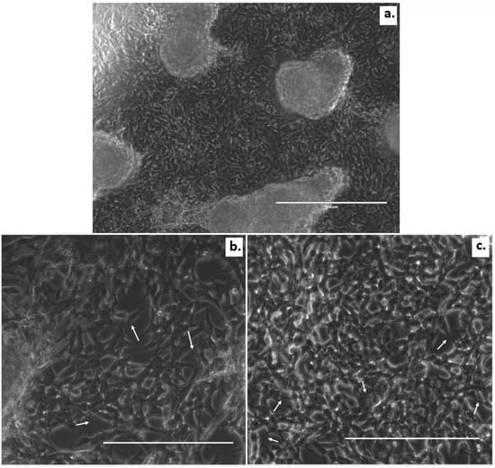Morphology of the SH-SY5Y neuroblastoma cells in 3D culture. A larger field of view of the SH-SY5Y cells with GelMA on top on day 5 (a). The SH-SY5Y cells with GelMA on top imaged on day 1 (b) and day 5 (c). Images were taken using a EVOS FL microscope (Thermo Fisher Scientific, Eindhoven, The Netherlands) in the bright-field mode. White arrows indicate neuron-like phenotypes and neuronal outgrowths. The scale bars indicate 400 µm (a) and 200 µm (b,c).