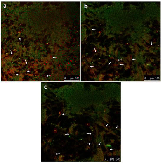 Confocal microscopy images of 3D SH-SY5Y cells in the GelMA. The staining displays neuron-specific protein -Tubulin III (red) and cell nuclei dye (green). The maximum intensity projection of slices for the range of 0 to 60 µm from the bottom surface. The scale bars denote 100 µm. (a) Maximum intensity projection of slices for the range of 0 to 10 µm from the bottom surface. (b) Maximum intensity projection of slices for the range of 24 to 36 µm from the bottom surface. (c) Maximum intensity projection of slices for the range of 50 to 60 µm from the bottom surface. The slices were taken at an interval of 2 µm. Arrows in subfigures (a–c) indicate neuronal outgrowths.