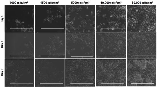 3D SH-SY5Y neuroblastoma cell cultures in GelMA within a PDMS ring on glass coverslips observed on day 1, 3, and 6, starting from different initial cell densities. Representative images were taken with an EVOS FL microscope in the bright-field mode. The scale bars denote 400 µm.