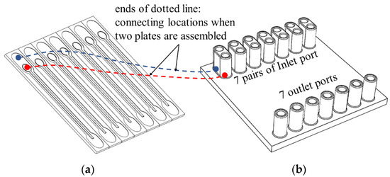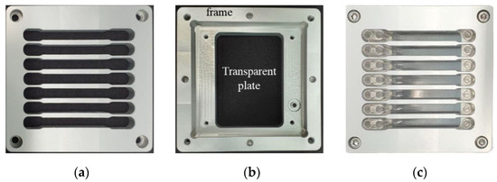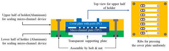 For sealing micro-channels and making the micro-channel device work, we stacked the micro-channel plate and cover plate and inserted them between two halves of an aluminum holder assembled by bolting to press the plates tightly (Figure 4). As seen in Figure 10a, the upper half of the holder has ribs to press the cover plate with ports more evenly. The lower half of the holder presses the micro-channel plate injection molded with TPU, which is deformed easily and therefore is good for sealing of micro-channels when covered with a rigid plate. The lower half of the holder consists of a rigid outer frame and a transparent plate for monitoring the flow in the channel (Figure 10b). The transparent plate also supports the channel plate to prevent deformation or bending when the channel plate and cover plate are assembled tightly, which may result in leakage from the channels.