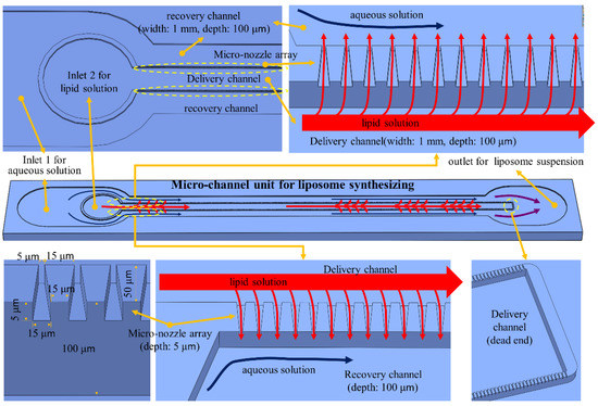 Figure 3. Schematics and design for a unit liposome-synthesizing micro-channel.