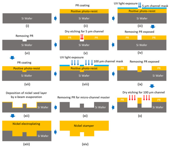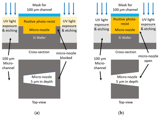 For injection molding of micro-channel plate, we fabricated a durable nickel stamper to be 0.5 mm in thickness and to have negative structure for micro-channel based on UV lithography process on silicon wafer and nickel electroforming process. The overall fabrication process for nickel stamper is shown in Figure 5. To fabricate stamper with channels of different depths, 5 μm-deep micro-nozzles, and 100 μm-deep delivery and recovery channel, we first fabricated silicon pattern master by repeating photo-resisting patterning and etching process twice, each using a different pattern mask, shown in steps (iii) and (viii) in Figure 5. Misalignment of these two masks can cause disconnection between the micro-nozzles and delivery or recovery channel, as shown in Figure 6a. To prevent this, we designed the masking region of the second mask aligned to the micro-nozzle array that was previously machined during steps (iii)–(vi) to be shorter by 5 μm than the length of the micro-nozzle to ensure the ends of the micro-nozzle were open, as shown in Figure 6b.