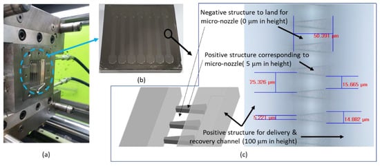 Figure 7. Images for (a) half of mold with an insert for injection molding, (b) micro-channel stamper insert, and (c) micro-channels and micro-nozzles on the stamper.
