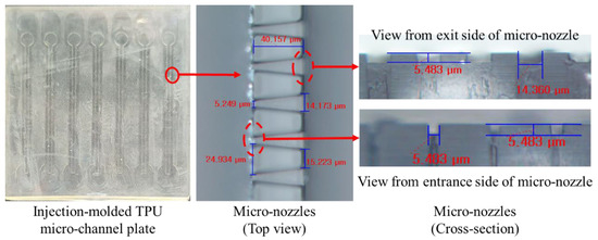 Figure 8. Photo for an injection-molded thermoplastic urethane (TPU) micro-channel plate and microscopic images for micro-nozzles.