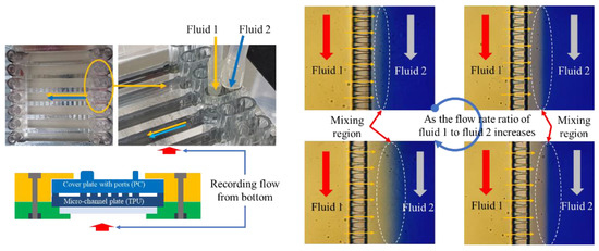 For testing flow and mixing of fluids through micro-nozzle and channels, we used two types of water, one yellow and the other blue, for visualization of flow and mixing. The yellow water was supplied to the delivery channel through the inlet port for lipid solution (inlet port 2 in Figure 3) and flowed into recovery channel through the micro-nozzle to mix with the blue water supplied to the recovery channel through inlet port for buffer solution (inlet port 1 in Figure 3). The flow rate for each fluid was controlled independently using a syringe pump, as shown in Figure 11.