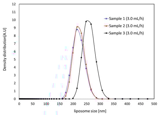 Figure 13. Liposome size distribution measured for three samples synthesized at 3.0 mL/h of lipid solution and 30 mL/h of saline.