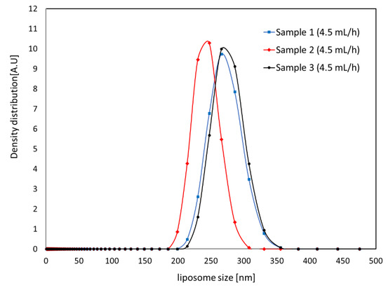 Figure 14. Liposome size distribution measured for three samples synthesized at 4.5 mL/h of lipid solution and 30 mL/h of saline.