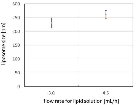 Figure 15 shows average size of liposomes for each flow rate conditions with error bar of one standard deviation. It is noticed that the size of the liposome can be controlled by flow rate of the lipid solution or buffer. As the ratio of lipid solution flow rate to the buffer flow rate increases, the characteristic time for mixing two solution increases also. This increase in mixing time may enhance the growth of the lipid bilayer and result in larger liposomes when the lipid bilayer forms a vesicle after linear growth [24,25,26]. However, extended experimental investigation may be required to figure out the effect on the size of the liposome for a wider range of flow rate conditions.